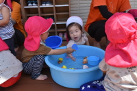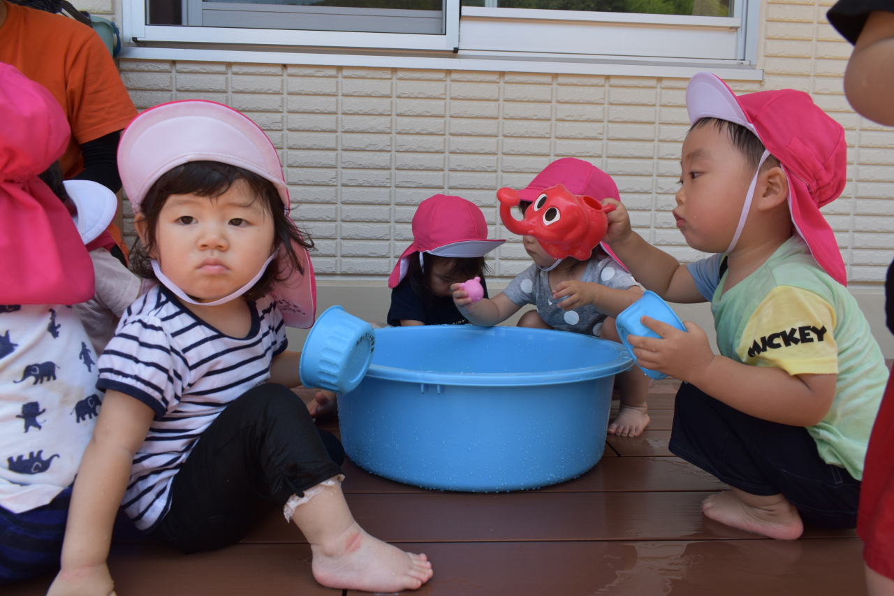 ウッドデッキにて、水遊びをしました。まだ水が怖い子もいましたが、それでも歓声をあげながら遊んでいます。