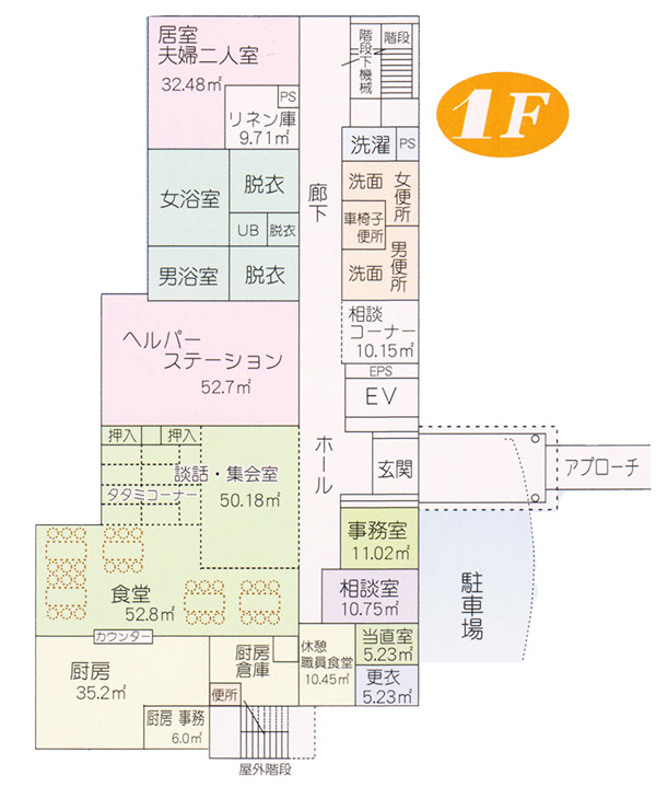 当施設の1階部分には主として食堂、談話コーナー、浴室等共用施設が設置されております。皆が集まり、「楽しく、明るく、賑やかな」空間が広がります。