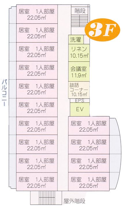 1階に夫婦部屋(1室)、2階に個室(14室)、3階に個室(14室)の計29室となっております。全館、全室バリアフリー設計になっており、居室はもちろんの事、共用設備においても段差が全くありません。