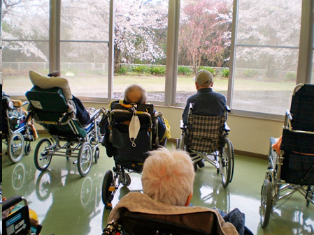 広々した玄関ホールで体操やレクリエーションや行事などしています。春には窓から桜がきれいに見えます。