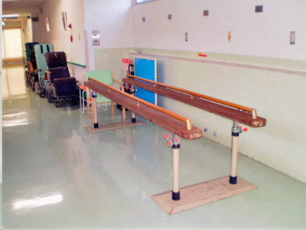 立位訓練などをしたり、テレビを見たり歌体操をしたり新聞を読んだりそれぞれに過ごされています。平行棒で歩行訓練もしています。